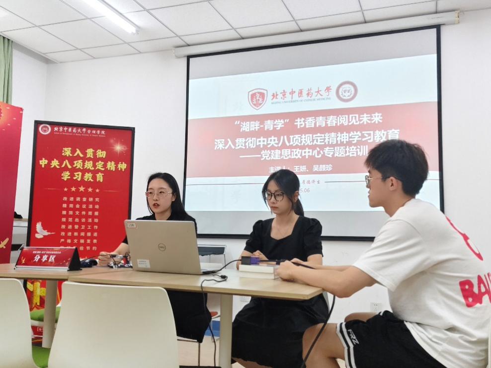 6月6日,支部邀请学院党委副书记周磊为支部全体党员、发展对象讲授《学习中央八项规定精神之党团建设》专题党课。在周磊书记的指导下,一支部强化政治引领,打造以党建带团建的学习模式。6月23日,支部书记王妍、支委吴颜珍在开云kaiyun官方网站“湖畔·青学”阅读室,进行《深入贯彻中央八项规定精神学习教育---党建思政中心专题培训》。6月25日,支部副书记范明惠、支委邓杰文为支部全体党员讲授《学习习总书记关于加强党的作风建设的重要论述》主题党课。6月26日,支部书记王妍为一支部全体党员讲授《以中央八项规定精神为纲,筑牢作风建设根基》专题党课。通过分层分类授课,突出抓好学生党员、学生干部学习教育并辐射广大学生,推动中央八项规定精神在学生群体中落地生根。