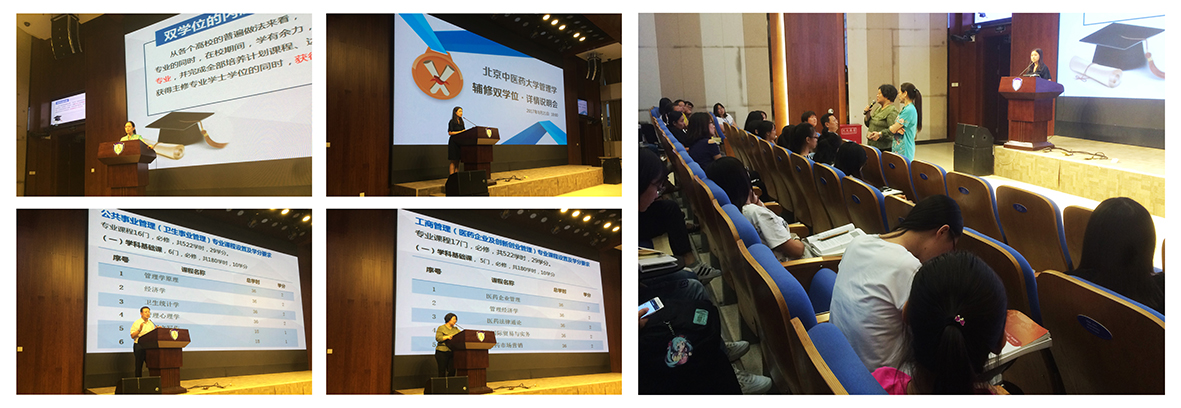 说明会由王鸿蕴老师主持,首先从招生专业、招生对象、学制及报名方式等方面简单介绍了管理学辅修双学位招生简章。李瑞锋副院长、谭巍副主任分别就此次开设的两个专业——公共事业管理(卫生事业管理)专业、工商管理(医药企业及创新创业管理)专业进行介绍,并对培养目标、培养方案及实践教学环节进行详细的解读说明。程薇院长综合总结了管理学辅修双学位的申办历程、成为复合型人才的重要性及学习管理学的意义。最后现场答疑环节,同学们踊跃就所关心的课程安排、学位性质、就业优势等问题进行咨询,我院老师们一一给出了满意的答复。