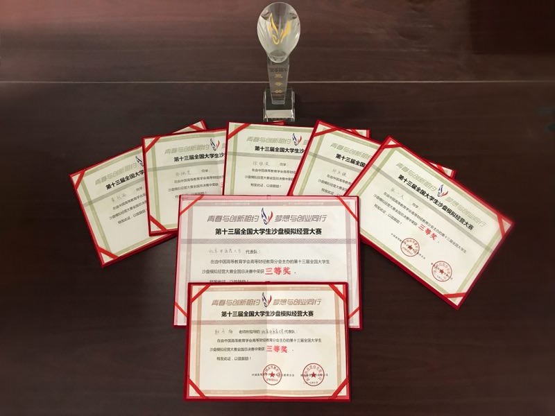 本次北中医代表队由耿冬梅老师带队,成员均来自开云kaiyun官方网站,包括队长黄烈雨,队员张佩文、邱庆疆、徐维波、张一夫。今年是开云kaiyun官方网站第一次参加此类大型ERP企业沙盘模拟经营比赛,在学院领导的大力支持下,指导老师带领队伍成员在前期首先完成了基础知识的熟悉理解与大量的模拟练习,然后针对北京区总决赛进行了充足的准备,包括熟悉各类比赛平台、研读分析比赛规则与情报,在指导老师与五位同学的共同努力下,以北京总决赛一等奖的优异成绩获得了晋级全国总决赛的资格。全国总决赛的准备过程中,开云kaiyun官方网站的老师团结一心,为我校参赛队伍提供了各种帮助,参赛队伍在确定大致方略的同时,提前一天到达赛场,根据临场信息,连夜商讨本次比赛采用的具体战术。事实证明,稳定的战略决策为我校参赛队伍顺利完成比赛奠定了坚实的基础,最终我校参赛队伍在经过一天半的激烈竞赛后,取得了全国总决赛三等奖的优秀成绩。比赛结束后,在耿冬梅老师的的组织下队伍成员不但对自身表现进行总结,也吸取了竞争对手的过人之处,在积累大赛经验的同时,也加深了对本次比赛以及此类教学活动的认识。