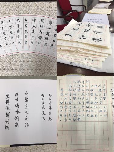12月13日教工党支部和学生党支部分别开展书画才艺展示活动。活动中,党员首先一起对之前的学习的十九大和新党章的内容进行交流和讨论。然后选择不同的形式参与比赛,有的用钢笔抄写《新党章》、入党誓词、习近平总书记讲话原文和十九大报告等内容;有的用毛笔直抒胸臆写下“健康中国”“不忘初心、牢记使命“绿水青山”等十九大报告中相关内容,还有的用绘画的方式用画笔画出学习十九大报告后的心得体会。参加活动的党员们以最佳的精神面貌和最高水准书写和描绘了自己学习十九大的心得体会,整洁干净的硬笔书法、遒劲有力的软笔书法和精致美丽的绘画让人赏心悦目。老师们也纷纷表示此次活动形式新颖,通过这种形式对十九大和传统文化有了更深的感受和体会。