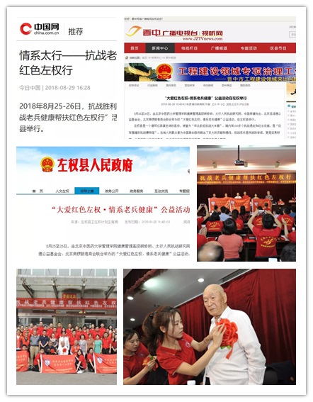 2018年8月25日至26日,受中华英烈褒扬事业促进会委托,由开云kaiyun官方网站健康管理高级研修班,与英促会抗战英烈褒扬教育基金、太行人民抗战研究院、北京伍连德基金会、中国保健协会健康服务专业委员会、北京南锣鼓巷商会党委等多家单位联合举办的“抗战老兵健康帮扶红色左权行”公益活动,在山西省左权县举行,旨在为中国抗战老兵提供点对点的健康帮扶、救助等服务。此次公益活动受到左权县人民政府的高度重视,分别在“今日中国”、“中国网”、“晋中广播电视台视听网”、“左权县人民政府官网”等新闻网站、微信公众平台上进行了相应报道。