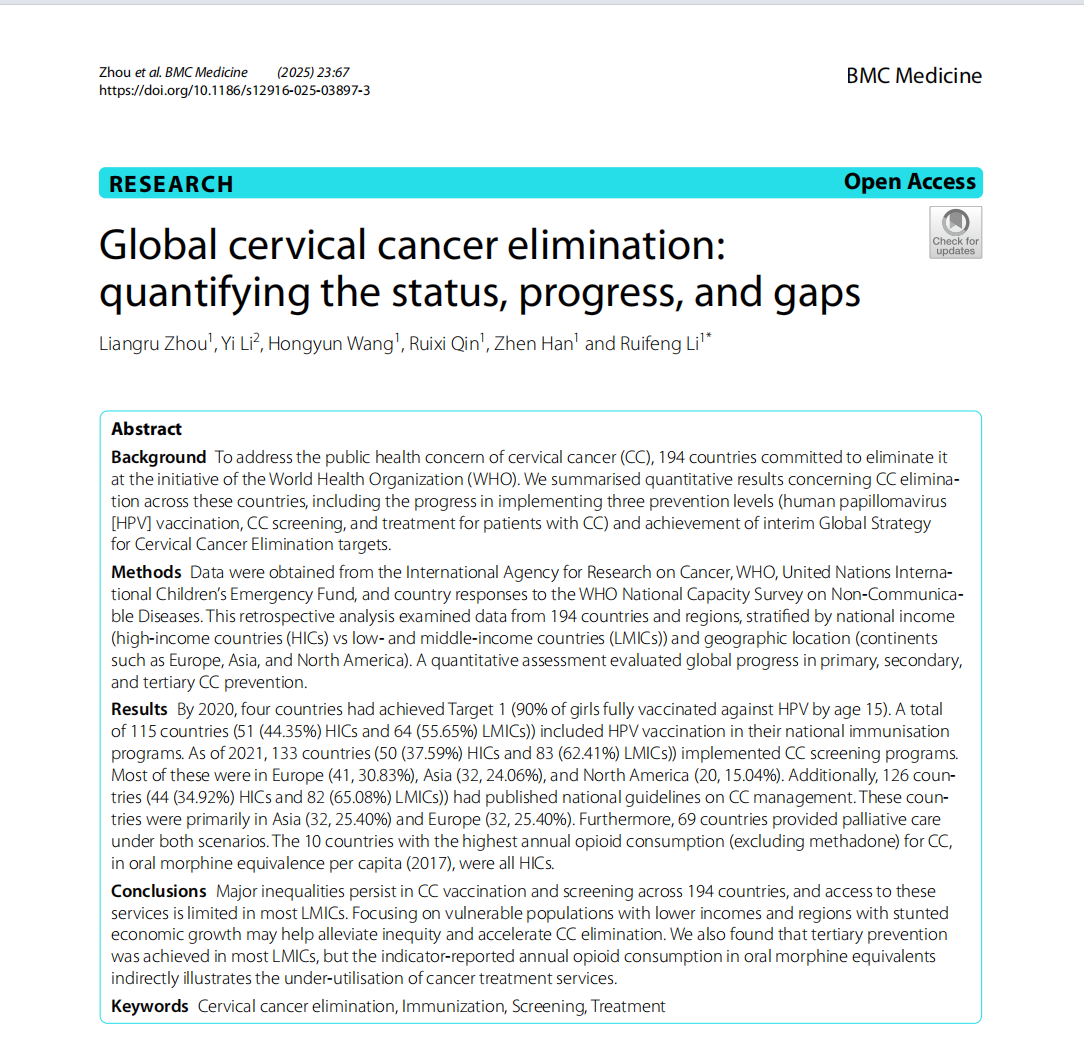 开云kaiyun官方网站周亮茹、李瑞锋利用国际癌症研究机构(IARC)、世卫组织/儿童基金会以及各国对世卫组织非传染性疾病国家能力调查的答复数据,系统分析了消除宫颈癌过程中HPV疫苗接种、宫颈癌筛查、宫颈癌患者预防措施的实施进展,最后探讨了消除宫颈癌可能面临的挑战。研究成果 ”Global cervical cancer elimination: quantifying the status, progress, and gaps”于2025年2月4日在BMC Medicine上以封面文章的形式发表:“The World Health Organisation (WHO) launched the Global Cervical Cancer Elimination Initiative in May 2018, and 194 countries committed to it. Here, researchers quantify the progress and gaps in achieving cervical cancer elimination.”。