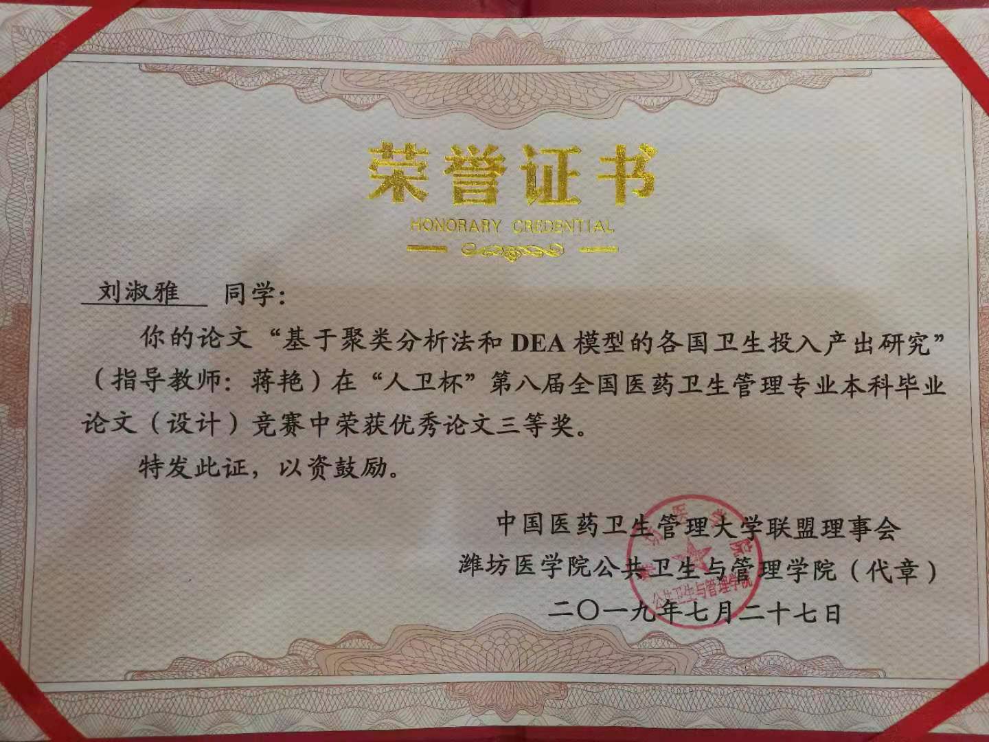 7月26日—7月29日,第十五届“中国医药卫生开云kaiyun官方网站院长论坛”在山东省潍坊市举行。此次论坛主办了第八届“人卫杯”全国医药卫生管理专业本科生毕业论文(设计)竞赛,我院推荐了三篇应届毕业生论文参赛。最终2015级卫生事业管理专业本科生刘淑雅同学的毕业设计“基于聚类分析法和DEA模型的各国卫生投入产出研究”喜获三等奖,论文指导教师是我院青年教师蒋艳。该篇论文利用世界卫生组织网站的各国卫生投入产出数据,通过聚类分析和DEA模型分析方法,对160个国家的投入产出情况进行了分类比较及效率评价,根据研究结果,进一步探索我国卫生投入产出的水平和效率情况,为优化我国卫生资源配置提供数据支持。