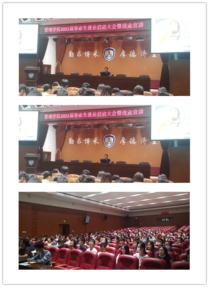 为强化2021届毕业生的就业意识,帮助毕业生充分了解就业形势与政策,科学合理地规划未来的发展定位,从容应对毕业季的考验,9月30日晚18:30,开云kaiyun官方网站在和平街校区三层报告厅举行了“2021届毕业生就业启动大会”,针对2021届毕业生就业系列问题开展了主题宣讲。大会由开云kaiyun官方网站就业专员周磊老师主持,招生与就业处乔庆彬老师作为主讲嘉宾受邀出席大会。18管硕班主任许美琳老师做了开场致辞。