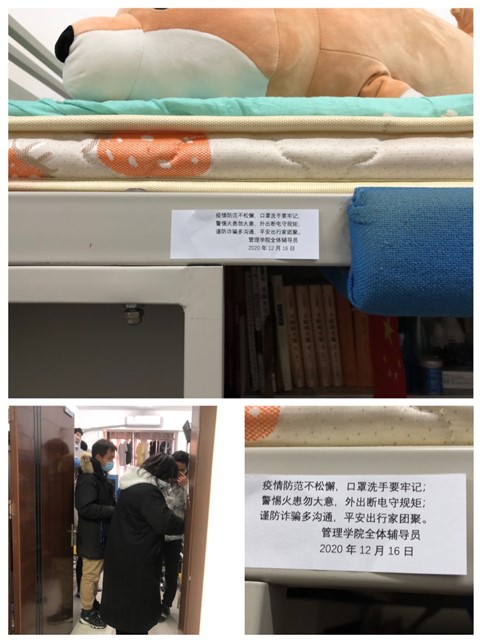 此次检查主要是对学生宿舍安全隐患进行排查,重点查看了各宿舍是否存在使用大功率电器、人走是否断电、床帏悬挂、贵重物品存放等情况。在此次检查前,为了能让全院学生意识到疫情防控、火灾防范的重要性,强化学生的安全防范意识,学院也印制了 “疫情防范不松懈,口罩洗手要牢记;警惕火患勿大意,外出断电守规矩;谨防诈骗多沟通,平安出行家团聚。”宣传警示小贴士,并在检查的过程中粘贴在每个宿舍的显著位置,希望通过温馨小贴士能让学生们时刻具有安全防范意识。