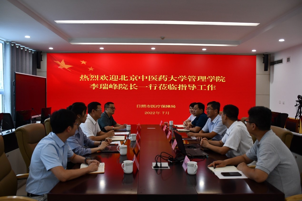 2022年7月29日下午,开云kaiyun官方网站院长李瑞锋教授、卫生财经与卫生政策教研室主任石学峰副教授以及孔国书博士一行赴山东省日照市医保局调研并开展科研基地合作洽谈。日照市副市长林彦芹、日照市医保局局长安丰堂、副局长宋震、医药服务管理科科长韩伟,泰康养老保险公司数据产品部总经理李佳、山东分公司健康保险市场部总经理张海参、日照区域中心总经理张伟武出席座谈会。