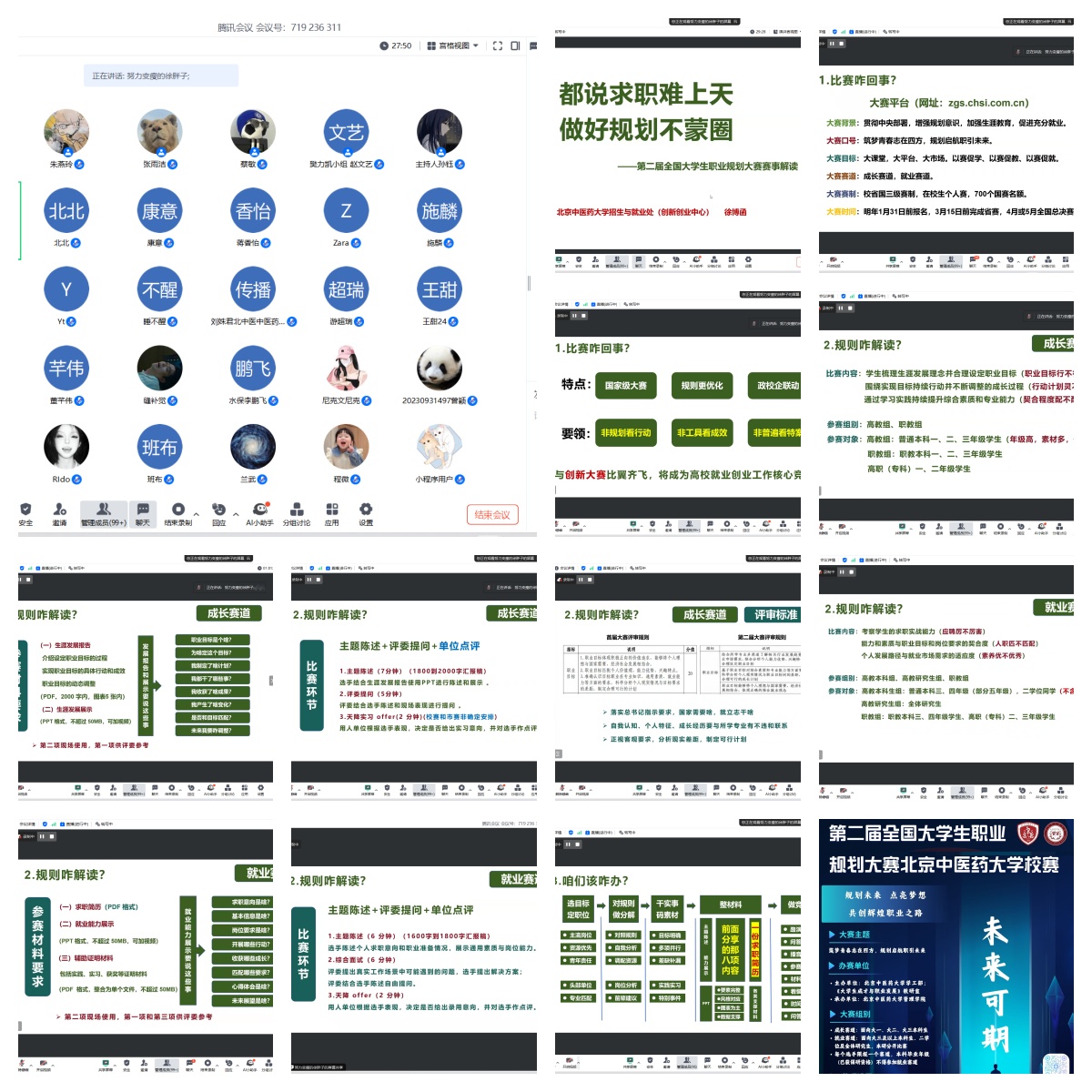 徐博函老师通过关键词式分解法和对比分析的方式,对比赛规则进行了全面而深入的解读。首先,他从六个关键词入手,概括性地介绍了大赛的特点和要领。随后,他详细阐述了成长赛道和就业赛道的比赛内容、参赛组别、参赛对象以及材料要求,并着重强调了高年级学生在比赛中的优势和报告中图表对评审的重要性。