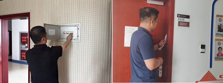本次检查重点查看了实验室用电安全、消防设施及门窗防护等情况。每个实验室都关闭设备、门窗,切断电源,并贴上封条,切实做好防火、防盗工作。对于假期中使用的实验室,也记录提交了实验室使用备案表,叮嘱使用的老师注意实验室安全。学院始终坚持"安全第一、预防为主"的安全原则,坚持做好日常安全管理工作,要求各实验室严格执行"人走断电"制度,确保消防通道畅通。通过此次检查,进一步强化了师生安全意识,为暑假期间实验室安全稳定运行提供了保障。