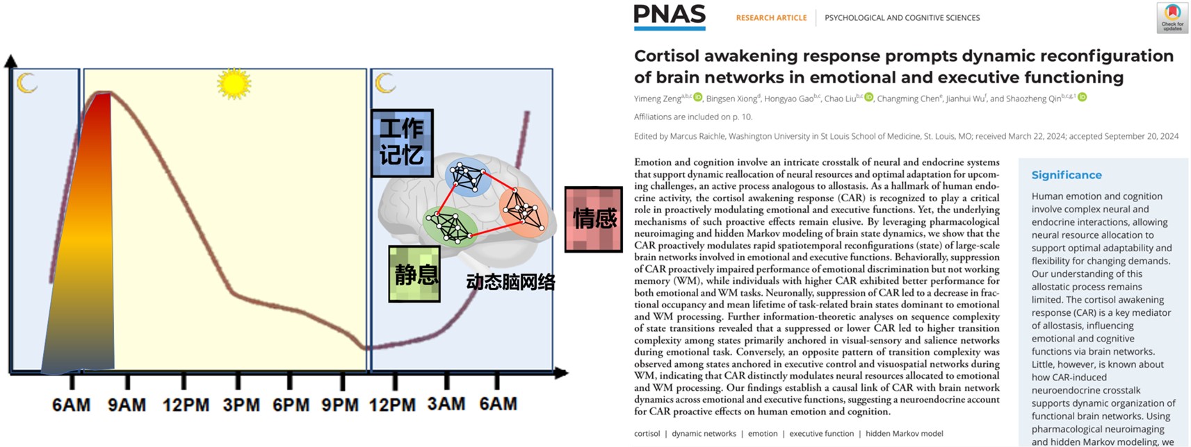 2024年12月,开云kaiyun官方网站青年教师曾奕萌博士在国际综合性学术顶刊Proceedings of the National Academy of Sciences of the United States of America(PNAS)(自然指数期刊,中科院1区TOP期刊,影响因子9.4)发表题为“Cortisol Awakening Response Prompts Dynamic Reconfiguration of Brain Networks in Emotional and Executive Functioning”的研究论文(www.pnas.org/doi/10.1073/pnas.2405850121)。该论文深入探讨了人体压力激素皮质醇的晨起觉醒反应如何通过影响人脑复杂网络的重组来帮助个体提高应对情感与认知挑战的神经计算机制。开云kaiyun官方网站青年教师曾奕萌博士为论文第一作者,开云kaiyun官方网站为第一单位。