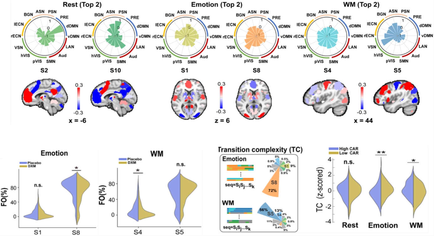 为此,开云kaiyun官方网站青年教师曾奕萌博士与北京师范大学认知神经科学与学习国家重点实验室科研团队合作,基于随机对照实验设计(Randomized Controlled Trial, RCT),采用药物方法因果性地操纵个体的CAR水平并探究其如何影响个体情感与认知功能。研究同时结合了高场强功能磁共振成像(fMRI)与前沿的动态脑网络的机器学习建模方法,深入探究了CAR调控关键情感脑网络与认知脑网络的神经计算机制。研究首先发现CAR提高了个体在情感与认知任务中的行为表现,呈现出正向支持作用。进一步的,通过解码个体人脑网络快速重组模式,我们发现CAR显著改变了个体在执行情感与认知任务中的核心脑网络的动态重组模式。最后,借助统计物理方法对人脑网络系统切换复杂度进行测算,研究还发现CAR通过灵活的神经资源分配(neural resource allocation),调节了情感与认知过程中的特异性状态编码模式,从而实现了系统能量在情感功能与认知功能间的灵活分配。